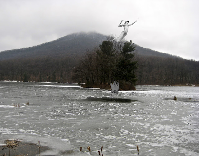 My husband and I are taking a class TOGETHER in an attempt to learn how to use PSE9. There are 3 of us in the class, and we are all having the best time. Of course, since we are the two with Apples we only complicate things. Tonight our lesson was to learn how to select portions of photos, move them into a new background, and then manipulate their sizes and colors within that background. This is the beautiful lake up at the Peaks of Otter taken last week with the addition of the hand rising from the ice and the bathing suit gal flying above the tree...a bit silly but lots of fun to create!