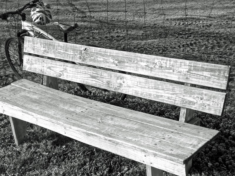 Bud and I visit the track at my old school on a daily basis. This is one of the benches where students and walkers/runners rest from time to time. It is where Buddy usually parks his bike. He rides the 7 miles down to the track and back to the house, and I drive the car.
